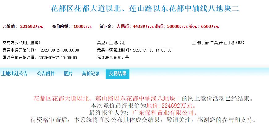 保利置業以224692萬元競得花都區花都大道以北、蓮山路以東花都中軸線八地塊二,溢價率1.4%,成交樓麵價10983元/㎡,實際樓麵價11591元/㎡。