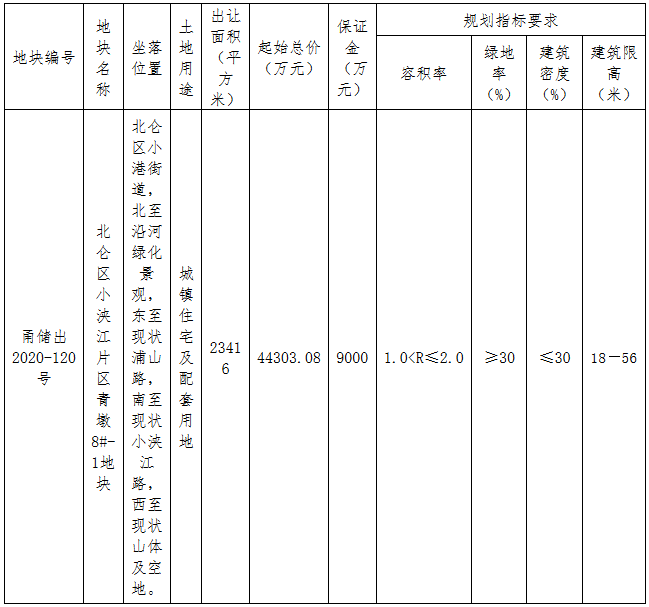 資料显示,該地塊編號為甬儲出2020-120號,位於北侖區小港街道,北至沿河綠化景觀,東至現狀浦山路,南至現狀小浹江路,西至現狀山體及空地。出讓面積23416㎡,起始價44303.08萬元,競買保證金9000萬元,建築密度≤30%,率≥30%,建築高度18-56米。