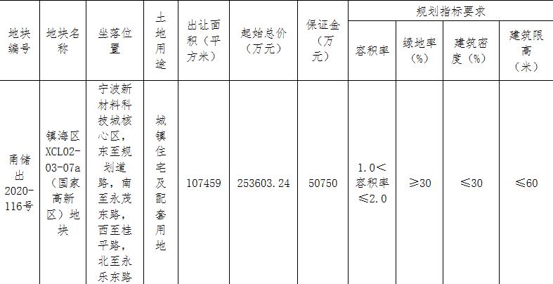 地塊編號甬儲出2020-116號,地塊名稱鎮海區XCL02-03-07a(國家高新區)地塊,出讓面積10.74萬平,用途為住宅用地,容積率2,建築面積21.49萬平,起始價25.36億元。