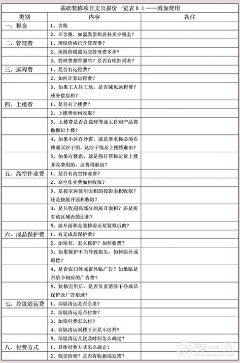 最後,也幫大家列個表,大家可以按照表格的內容來參考考慮裝修公司的報價,看看到底是不是象他們標榜的那樣絕無增項啥的!增項的產生是由於報價的模糊或刻意隱瞞,然後不得不發生,然後就和他們沒關係屬於業主自己的增項哈~